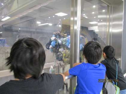 ゴミ収集車で運ばれたごみを、大きなクレーンでつかむ迫力ある動きを間近で見て、どの子も大興奮でした!