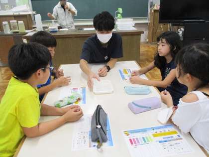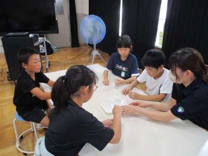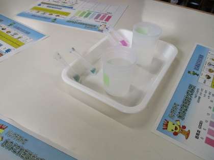 水質実験ではパックテストを用いました。検査液は,純水とオレンジジュース一滴が入った水を比較し,検査しました。