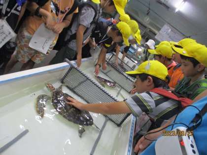 バックヤードツアー中に、アオウミガメをさわらせてもらいました!