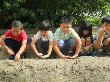 一人3粒ずつ種を受け取り、土に指を第1関節まで入れて穴を作り、3粒入れました。