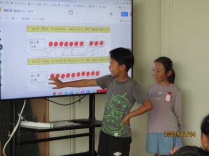 タブレット端末の画面上の数図ブロックを操作することで、減った数や増えた数をまとめてから計算するやり方が分かりやすくなりました。