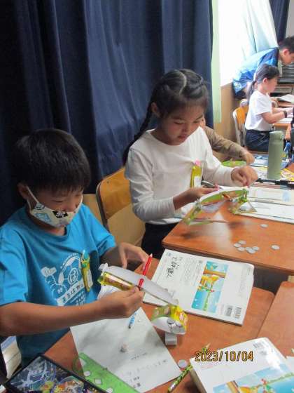 教科書の中に付いていた紙のはかりで、文房具の重さを調べていました。