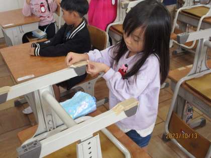 砂や石が入り込むのを防ぐために、いすの脚にガムテープを貼る作業を行っていました。