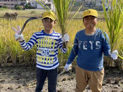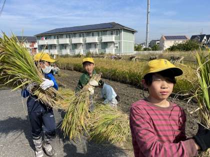 束になった稲は,想像よりも重くて苦戦していました。