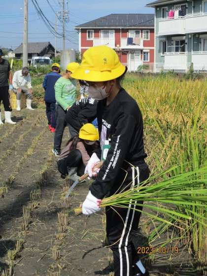 「この稲は、みんなが口にする食べ物です。食べ物は、必ず、丁寧に扱ってください。ポンと上から投げるようにしません。稲は、刈り取った下の部分がそろうように置きましょう」