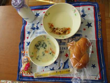 サケ入り豆乳シチューは、サケに加え、ほうれんそう、にんじん、玉ねぎ、コーンなどの野菜の様々な食感が楽しめました。