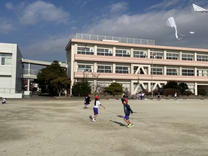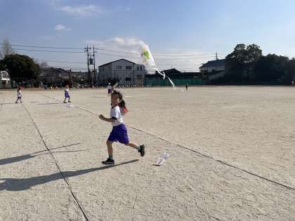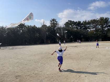 生活科「かぜとあそぼう」でたこあげをしました。風があったので上手にたこがあがりました。走り回ってとても楽しく遊ぶことができました。