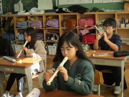 4年2組では、2分の1成人式で披露するリコーダーの練習をしていました。