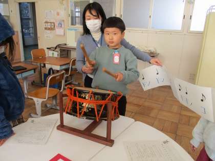 締太鼓の練習では、「ドンドコドン、ソーレ」とみんなで元気よく声をかけ応援しました。