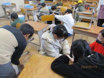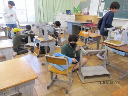 堅いネジをはずしたり、高さを調整してネジを止めたり、たくさんの机・椅子を効率よく協力して調節してくれました。ありがとう。