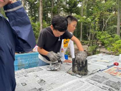 炊けた飯ごうをひっくり返して、新聞紙で磨いていきます。