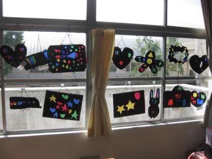 図工の授業で、「ひかりのおくりもの」を作りました。色のセロファンを貼り付け、美しい作品ができました。乗り物や動物など、工夫した形に仕上がりました。