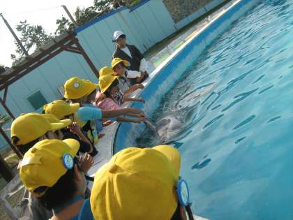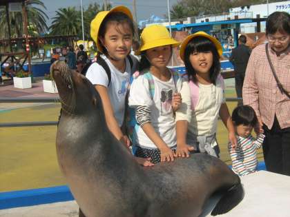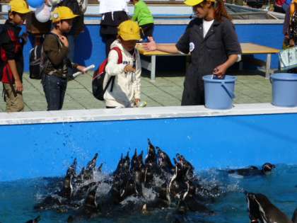 ふれあいホールでは、イルカ、アシカ、アザラシにタッチし、ペンギンにエサをあげることができました。