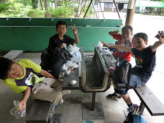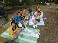 1日目の昼食の様子です。班ごとで木陰を見つけ,おいしく食べることができました。