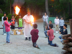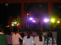 キャンプファイヤーの様子です。火の神から分火した火を,代表の5名が点火しました。マジック・クイズ・ダンスなど,児童が自分たちで考えたスタンツで盛り上がりました。