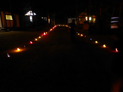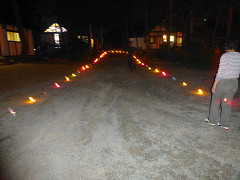 先生たちが作った「ファイヤーロード」です。児童から空き缶を集め,赤・青・黄など,さまざまな色で退場する道を作りました。