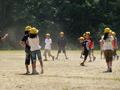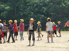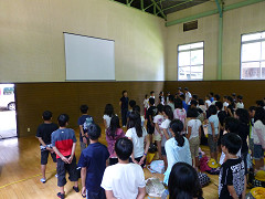 そうじの後,キャンプ場のグラウンドで,王様ドッジ・ダブルドッジをしました。暑い中でしたが,みんなで思いっきり体を動かし,キャンプの最後の思い出作りをしました。その後は,西浦南小学校と合同で閉村式を行いました。