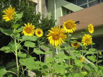 学級園のひまわりがみんな太陽に向かって咲いています。みんなもひまわりのように元気に夏休みを過ごしていますか。朝顔やふうせんかずらは種ができてきましたよ。みんなの朝顔はどうですか。