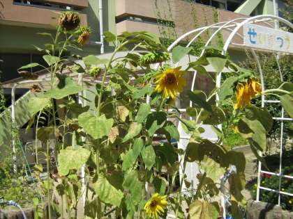 暑い中、オジギソウの花が咲きました。かわいいいピンクの花です。明日の出校日にぜひ見てくださいね。ひまわりの花は暑さのせいか、だらんと下を向いています。