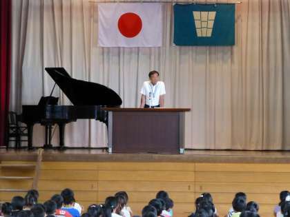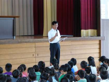始業式が行われました。校長先生のお話、校歌斉唱、生活指導の先生のお話がありました。どの子も元気一杯の笑顔でうれしく思いました。2学期は楽しみな行事がたくさんありますので、みんなで協力してがんばりましょう。