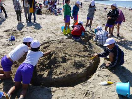 青空のもと,今年度の海のお祭りが行われました。5,6年生が企画,運営をし,たてわりグループごとにサンドアートを作ったり,海に向かってメッセージを言いました。どのグループも高学年を中心とし,協力して活動することができました。
