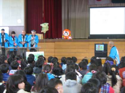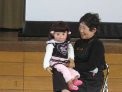 パワーポイントを使った「グラグラ森のおばけ」,腹話術による「ひとつのことば」,ペープサートを使った「あしたも友だち」という3つのお話をしていただきました。