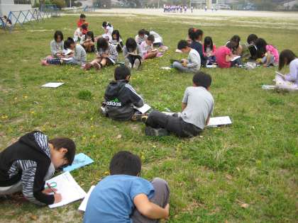 三年生から始まった理科の学習。観察カードの書き方を勉強してから,運動場に出て,タンポポを観察しました。虫眼鏡を近づけてよく見て,ノートに書きました。みんな熱心に取り組むことができました。