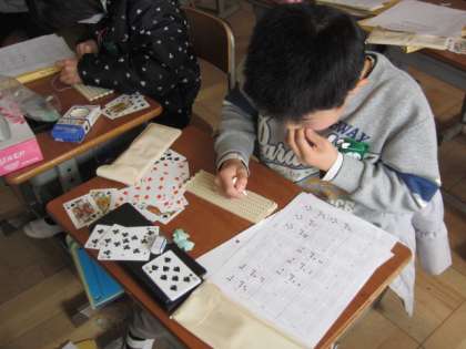 総合的な学習の時間に福祉について学んできたことを活かして,「点字付きトランプ」を作りました。自分の分担になっているトランプの点字を打つ子どもたちの姿は,真剣そのものでした。そして,なんとか6セットのトランプを作ることができました。このトランプは,点字板をお借りした常滑市社会福祉協議会に寄付しようと考えています。