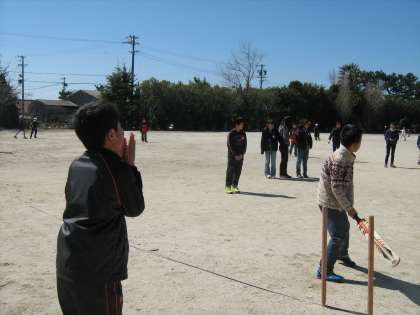 ALTのティモシー先生に「クリケット」を教えていただきました。3時間目は,クリケットが世界的に人気のあるスポーツであることや,どのように今のルールになったかという歴史などを聞き,子どもたちは興味津々でした。そしていよいよ4時間目は,1組と2組でクリケット対決!ルールを簡単にアレンジしてあるので,みんなが楽しむことができました。外国の文化に触れられる,よい機会となりました。