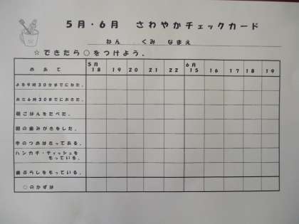 5月18日(月)から22日(金)まで、保健委員会による「さわやかチェック」を行っています。規則正しい生活を身に付けて健康に学校生活を送ることを目的にしています。朝の会の時に自分自身でチェックして記入します。(自宅には持ち帰りません)