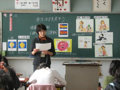 給食センターの栄養士さんに、「生活習慣病について」教えていただきました。生活習慣病が健康の柱である睡眠・食事・運動などの習慣がゆがんで起こる病気であること、生活習慣病を引き起こす食習慣は、塩分のとりすぎ・おやつの食べ過ぎ・外食が多いこと・野菜や果物の不足・朝食を食べないなどであることも知りました。この病気になると、血管がつまって血液の流れが悪くなる・心臓の動きが悪くなるなどこわい病気になりやすいことが分かりました。生活習慣病ってこわい、こわい。これからは、ちゃんと食事・運動・睡眠ー心がけようと思いました。