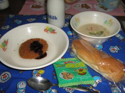 今日のメニューは、「米粉パン、冬野菜のクリーム煮、メンチカツ、豆腐スナック、牛乳」でした。