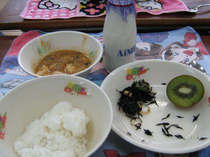 本日のメニューは「ごはん、マーボー豆腐、ひじきのサラダ、キウィ、牛乳」でした。