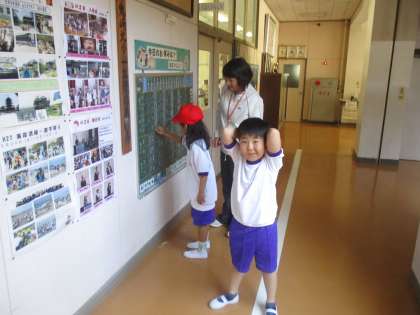 保健係がクラスの出欠について職員室前の黒板に書きに来ました。