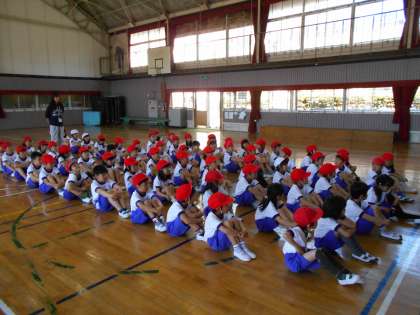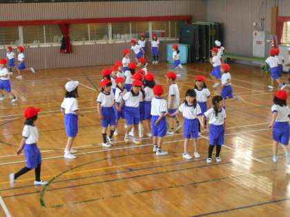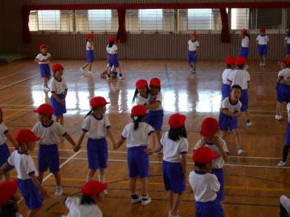 初めての合同体育は、「ならびっこ」や「手つなぎ鬼」をしました。背の順で並ぶことや、「前 ならえ」なども練習しました。もうどこでも、さっと並ぶことができます。手つなぎ鬼は、汗をかきながら走り回っていました。