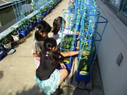 登校したら水かけ用のマイペットボトルを持って、一目散に野菜のところへ行きます。