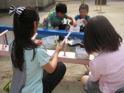 かたむき分度器を作って校庭のいろいろな場所の傾きを調べました。いざ調べてみると,シーソーやアミアミ遊具以外にも傾いているところがたくさんあり,みんな夢中になって調べることができました。