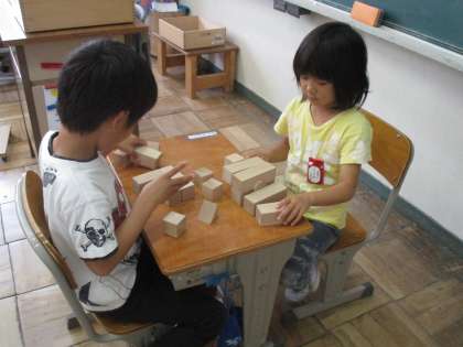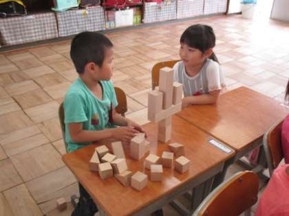 一人がいろいろな形をした積み木を組み合わせて好きな物を作ります。