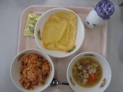 <献立> 白飯 オムライス用卵焼き チキンライスの具 野菜スープ 牛乳 乾燥小魚