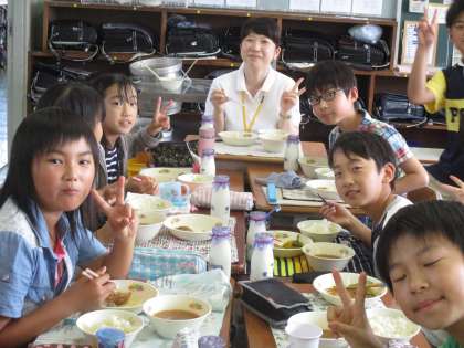 教育実習生の3人は担当学級で子どもたちと一緒に給食を食べています。