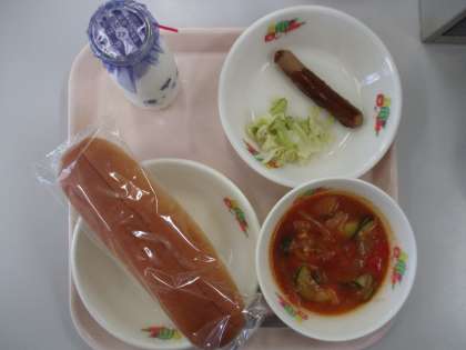 ロールパン、牛乳、ラタトゥイユ、ソーセージのデミソースかけ、キャベツソテー