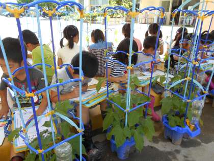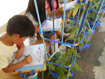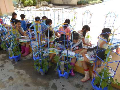 あさがおが大きくなってきました。つるが支柱をぐるぐるとまわっています。「先生、隣の子のところへ遊びに行ってるよ。」「どろぼうさんみたいに、だまってはいってるよ。」などと報告に来てくれます。もう、花が咲いている子もいます。これからの成長が楽しみです。