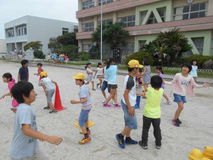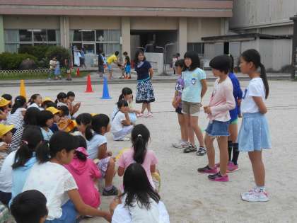 5年生が計画し、ルールを説明したり、ペアの子の手を引っ張ったりし、とても楽しそうに遊んでいました。