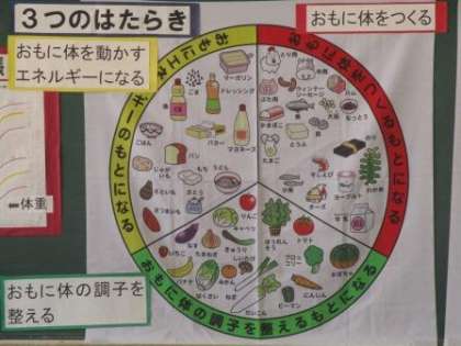 子どもたちは今朝食べた朝食を思い出して、3つがバランスよくとれているか調べました。