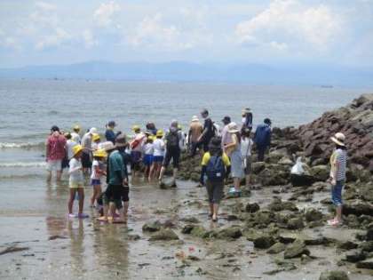 ひもに煮干しをつけて、岩場でカニ釣りをしました。