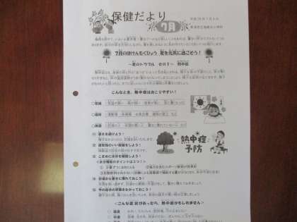 「保健だより7月号」は熱中症の対応について特集を組んでいます。