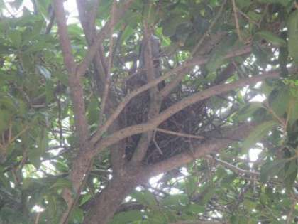 北館と体育館の間にある木に鳥の巣を発見しました。