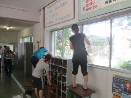 ガラスの飛散防止フィルムを職員作業で貼りました。