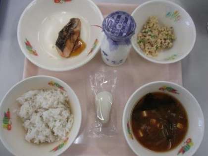 麦ご飯、牛乳、みそ汁、さけのきのこあんかけ、