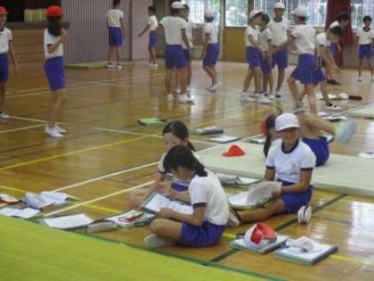 体育カードを使って友達の技を見ながら教え合っていました。